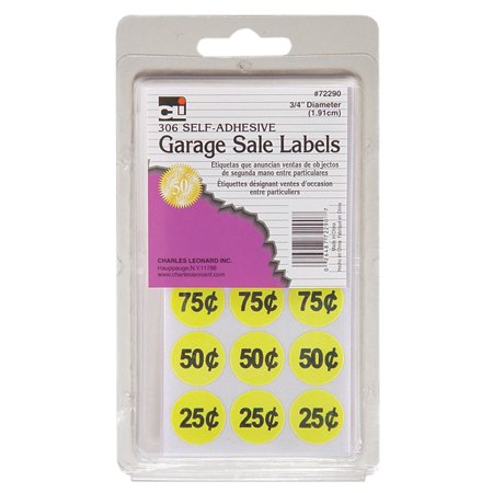 Avery Preprinted Removable Garage Sale Labels, 0.75 Inches ... Removable Preprinted Garage Sale Labels are round labels that feature preprinted popular prices ranging from 10 cents to $20, plus additional blank labels that allow you to add your own price. Bright neon colors draw the eye so customers can quickly locate pricing information without having to ask you.